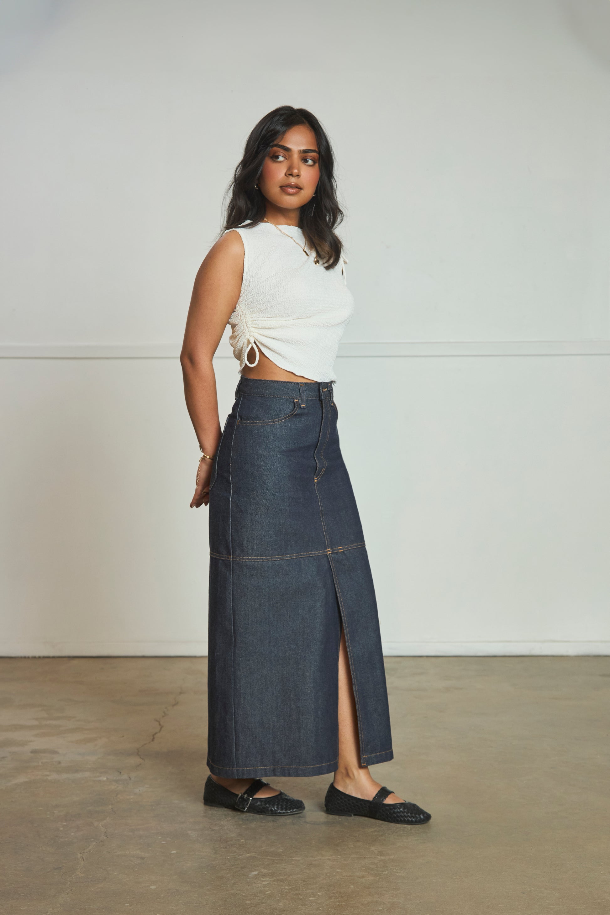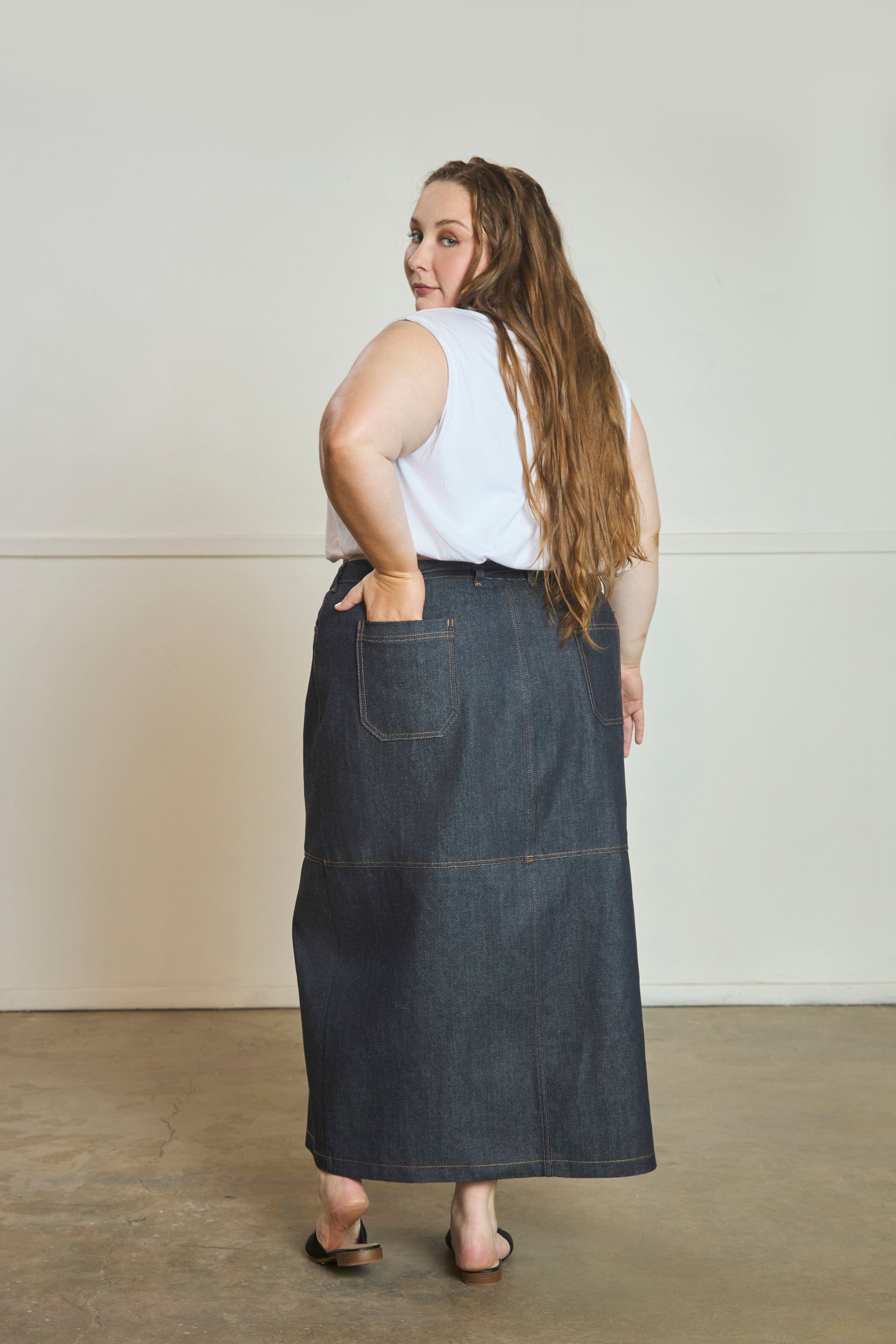 Our Heidi Maxi Skirt is made from premium 13oz Japanese denim, and features a slit starting 3" above the knee for easy movement. This style is named after our amazing patternmaker and co-designer, Heidi.
